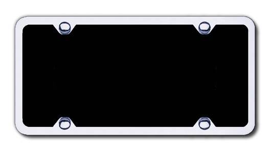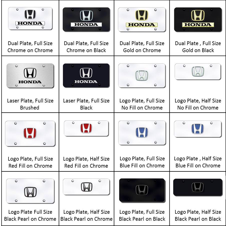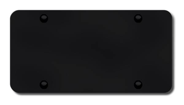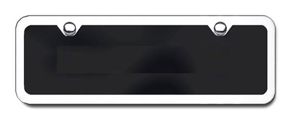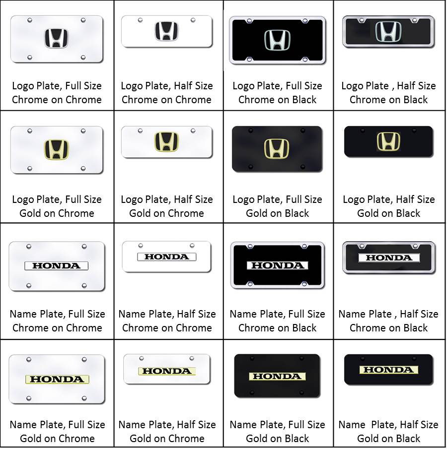 The full sized Black plates are polished thick acrylic and include a Chrome frame - these plates are used for most of the chrome logo or chrome name plates. They measure 6 x 12 inches (the same as a US license plate) and have 4 installation holes that are 7 inches apart. The name or logo on the plates will be 3 dimensional. An assortment of screws and matching screw cap covers are included with all the plates. The full sized black powder-coated stainless steel plates do NOT include a chrome frame. These plates are used for our "dual" plates which have both the vehicle logo and name on them, the gold logo or name plates, and the laser engraved plates. They measure 6 x 12 inches (the same as a US license plate) and have 4 installation holes that are 7 inches apart. An assortment of screws and matching screw cap covers are included with all the plates.